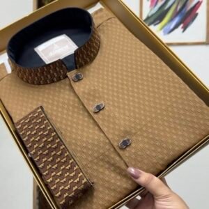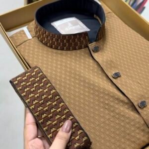 and reddish-brown embroidery on the collar and cuff